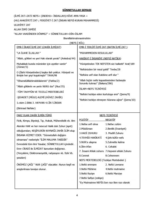 ÖZET= SÜNNETULLAH ŞEMASINDAN anlaşılacağı üzere İNSAN VE NEFS TEMELDİR: İşte İSLAM DİNİ İNSAN ve İNSANIN ve HAKKIN NEFSİ MERKEZLİ hukukullllah olan Sünnetullah ‘tır. İslam; Müslüman olmaktır. İslam; nefsin selamete (tezkiye) ulaşması ve Tevhid-i NEFS müşahedesi ile NEFS emanetini EHLİ OLAN HAKK’A TESLİM ETMESİ VE TESLİM SONRASI HAKKKIN NEFSİNİ VE NEFSİNDEKİ İLAHİ İSİM VE SIFATLARI KEMAL ÜZERE (MUHAMMEDİ-HADİ) ZUHURA ÇIKARMAKTIR. “LA İLAHE İLLALAH MUHAMMEDEN RESULULLAH” SÜNNETULLAH’IN İFADESİDİR.